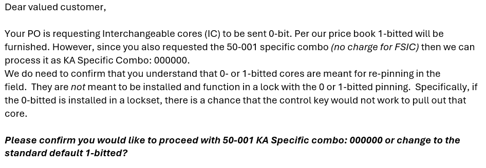 Orders can be placed for a 0-bitted FSIC by requesting the 50-001 keyed alike to a specified combination of 000000, e.g. 23-030 626 C 50-001 KA 000000. Technically, the 50-001 charge does not apply to FSIC cores, but must be utilized here, to clearly indicate we are providing 0-bitted.