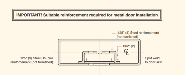 The Schlage L0170 half dummy trim can be mounted to a hollow metal door, however suitable door reinforcement must be added to the door. This reinforcement consists of a steel reinforcement bracket and a steel doubler plate which must both be spot welded to the skin of the door. This addition is typically done at time of door manufacture. Bracket and plate are not furnished with the dummy trim set, nor are they available for purchase from Schlage.