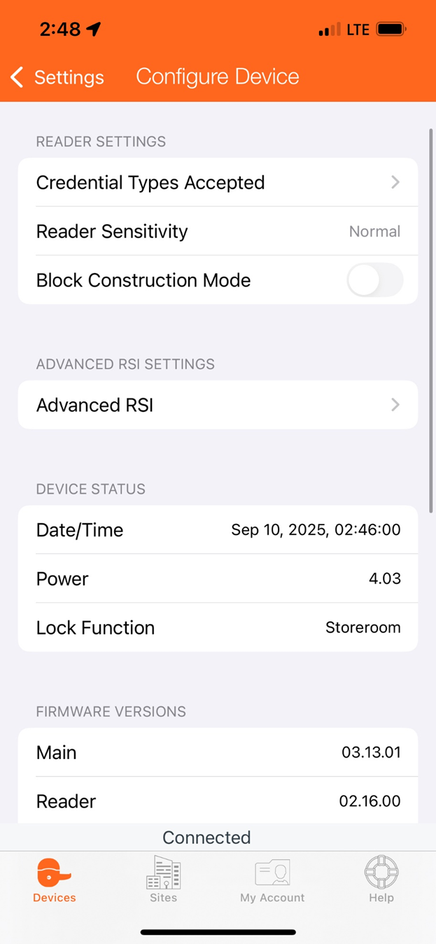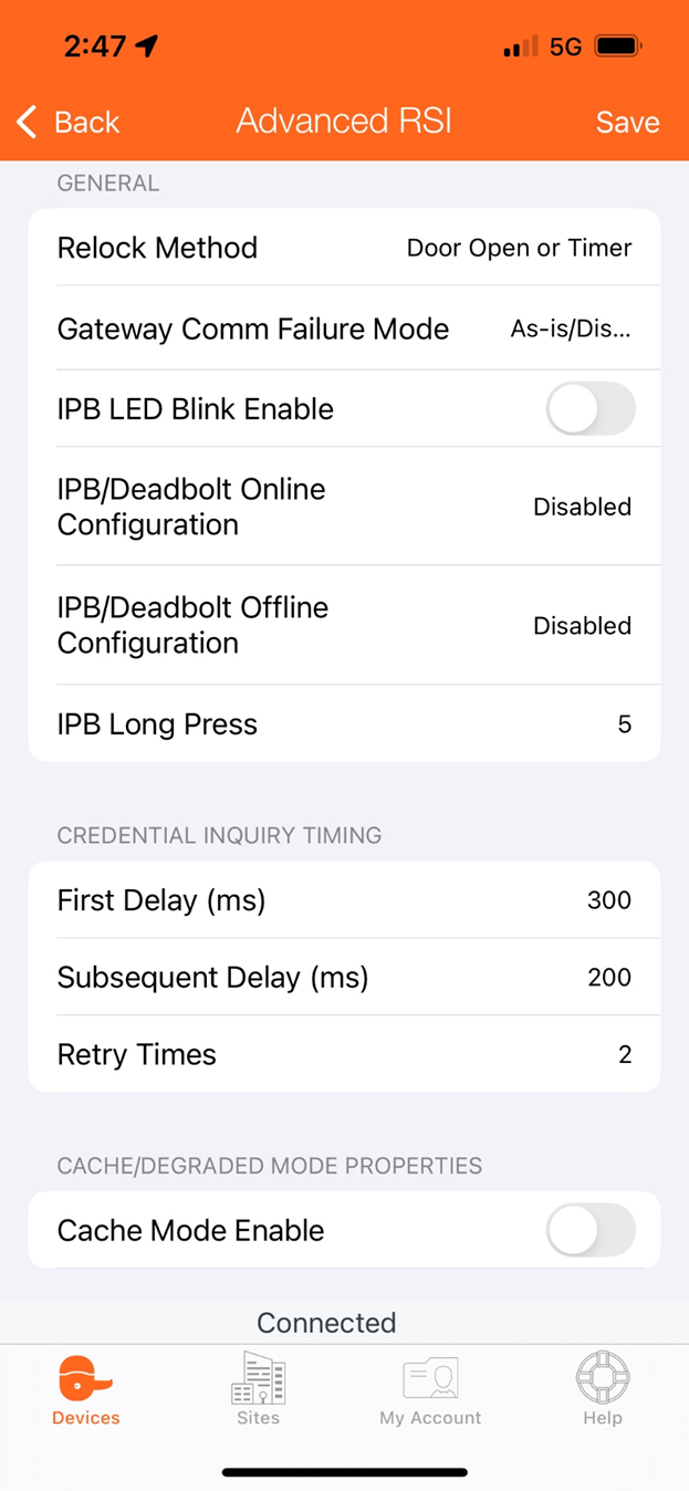 In Engage app, select the lock you want to make the changes to, click on More, go to Settings, Advanced, Advanced RSI, Cache Mode Enable